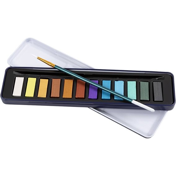 Paleta farb akwarelowych w 12 metalicznych kolorach. W zestawie pędzelek. Idealne dla miłośników malowania - nawet w podróży.