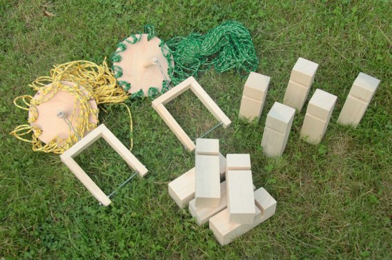 - Rozłóż klocki losowo na podłodze. Każdy gracz trzyma jeden lub dwa sznurki dźwigu. Sznurkami należy wspólnie unieść klocki tak, by powstała z nich wieża.