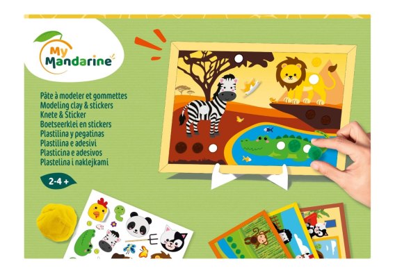 Zawartość: 4 dwustronne plansze do wyklejania (15x21 cm), 5 kolorów masy plastycznej Super-Softy (po 25 g), 1 arkusz A5 naklejek, 4 tekturowe stojaki do łatwej ekspozycji obrazków